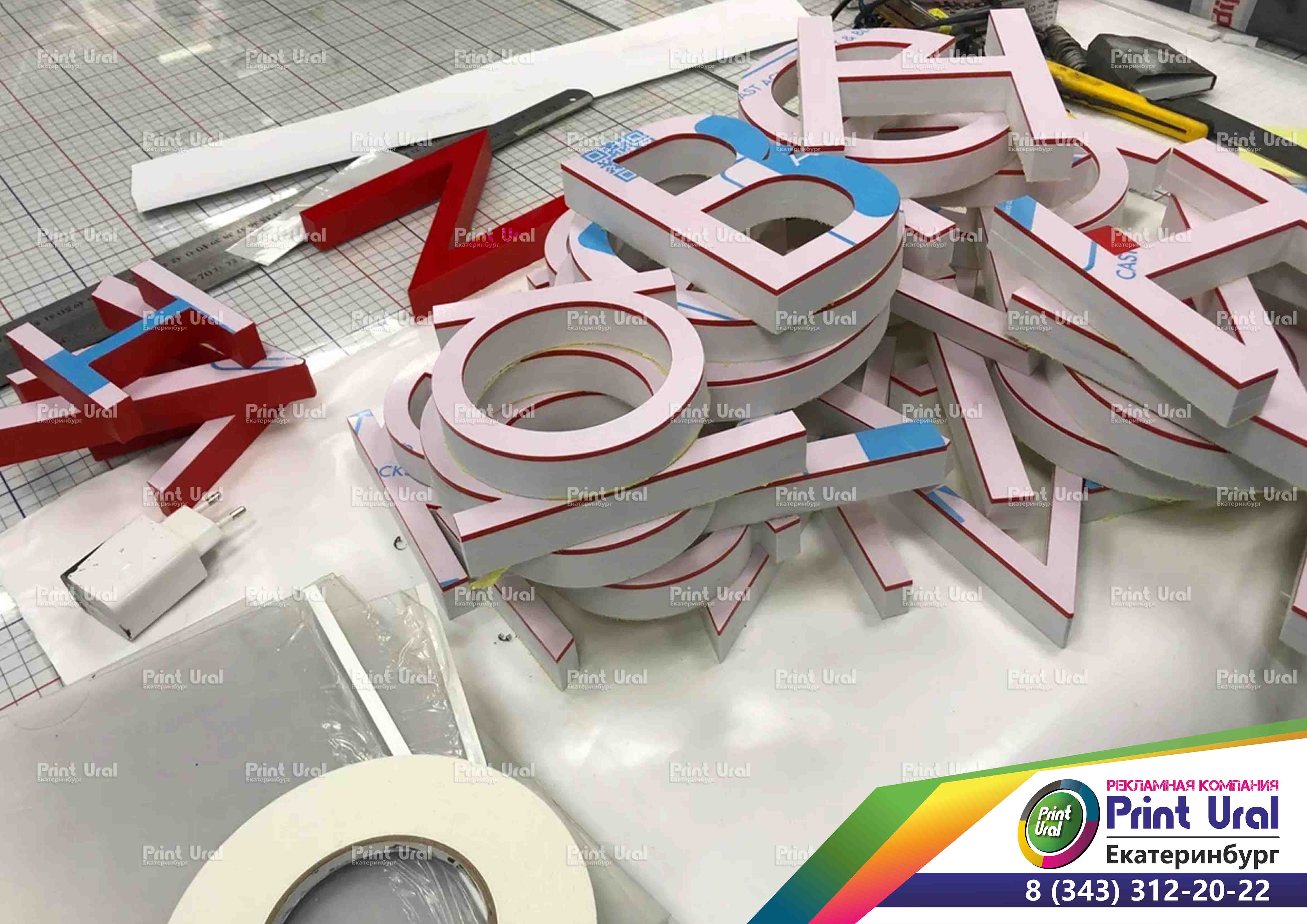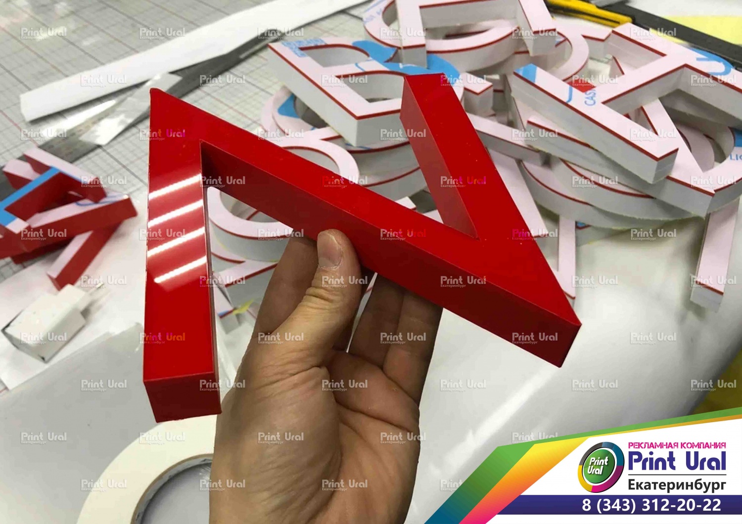 Буквы выполнены из пвх с применением красного акрила. Выбор цветовой палитры не ограничен
