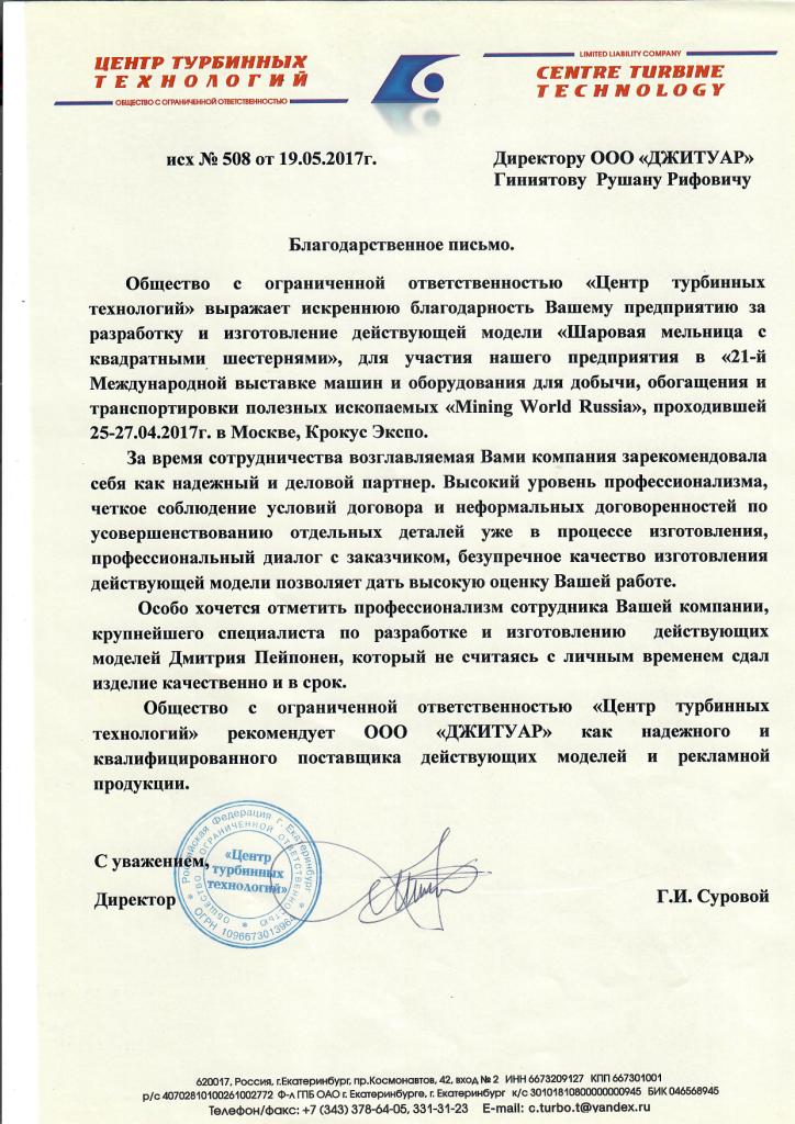 Благодарственное письмо от Центра Турбинных Технологий