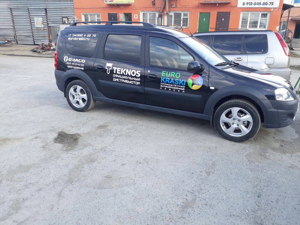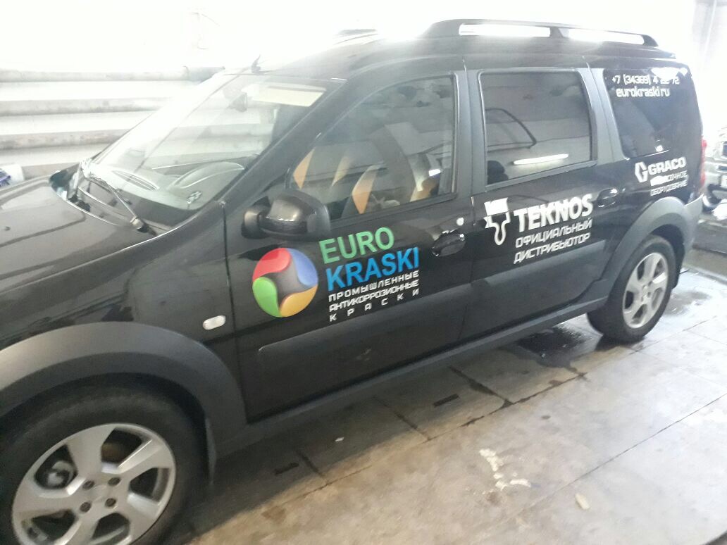 Так представители фирмы "Еврокраски", заказали брендирование авто марки "Лада Ларгус". Фирма "Еврокраски" занимается поставкой качественной краски, поэтому в работе был соблюден корпоративный стиль яркого логотипа.