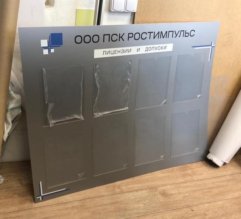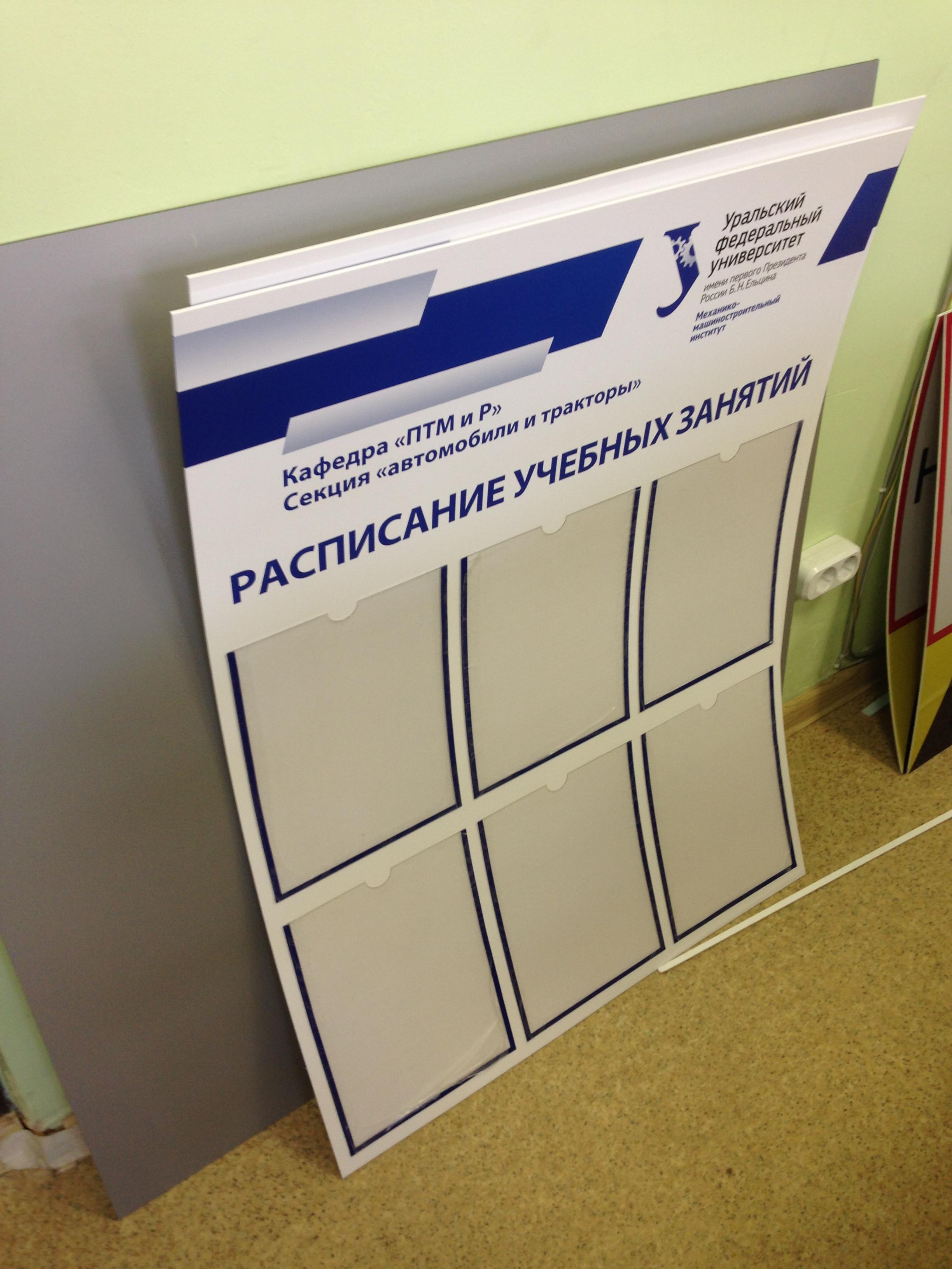 В компании «Print-ural» Вы можете заказывать доскус информацией любого дизайна и содержания.  Располагая обширным опытом, специалисты компании «Print-ural» разработали стандартные, наиболее востребованные образцы информационных досок. Стандартная информационная доска состоит из пластиковой основы, которая включает в себя четыре или шесть карманов формата А4. Но стиль, в котором выполнена информационная доска, может быть различным и даже выполненным в соответствии я корпоративными требованиями органицации-заказчика. Количество карманов может быть и индивидуальным.